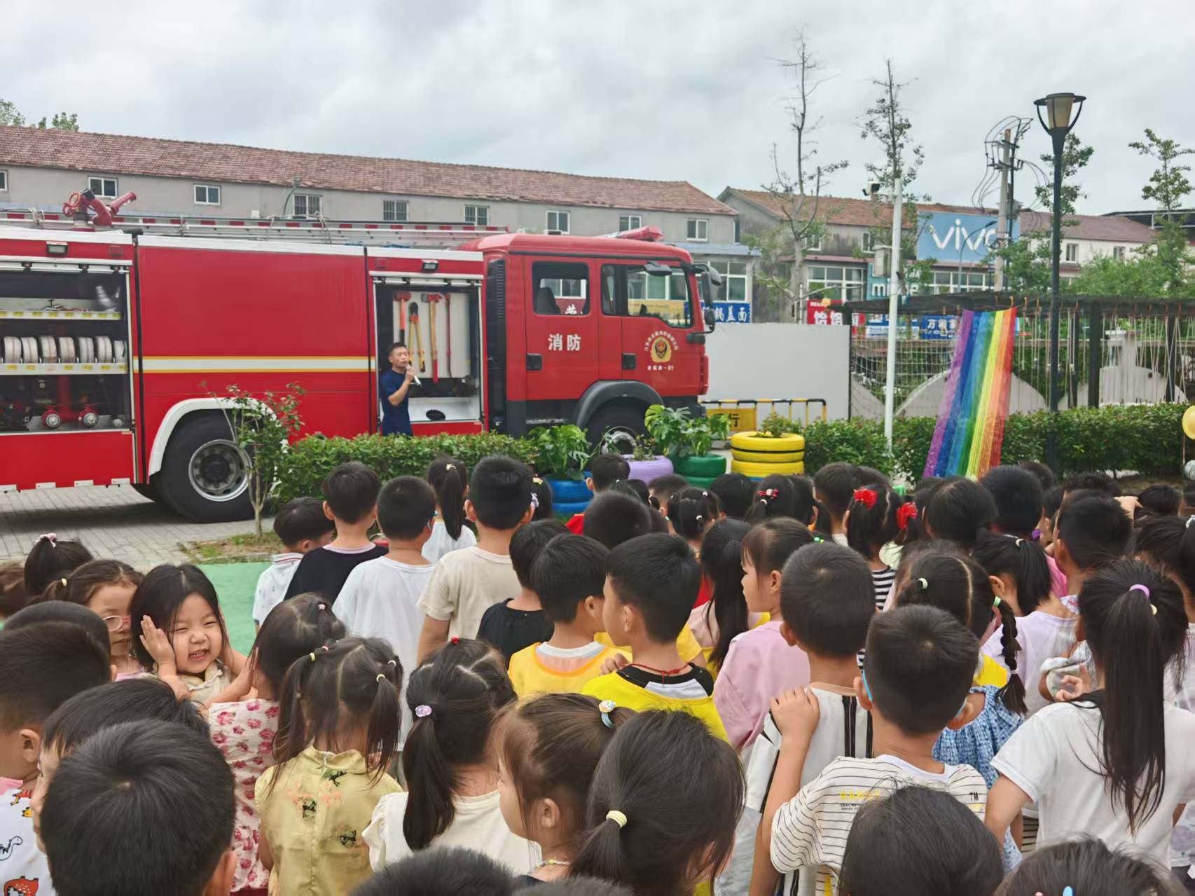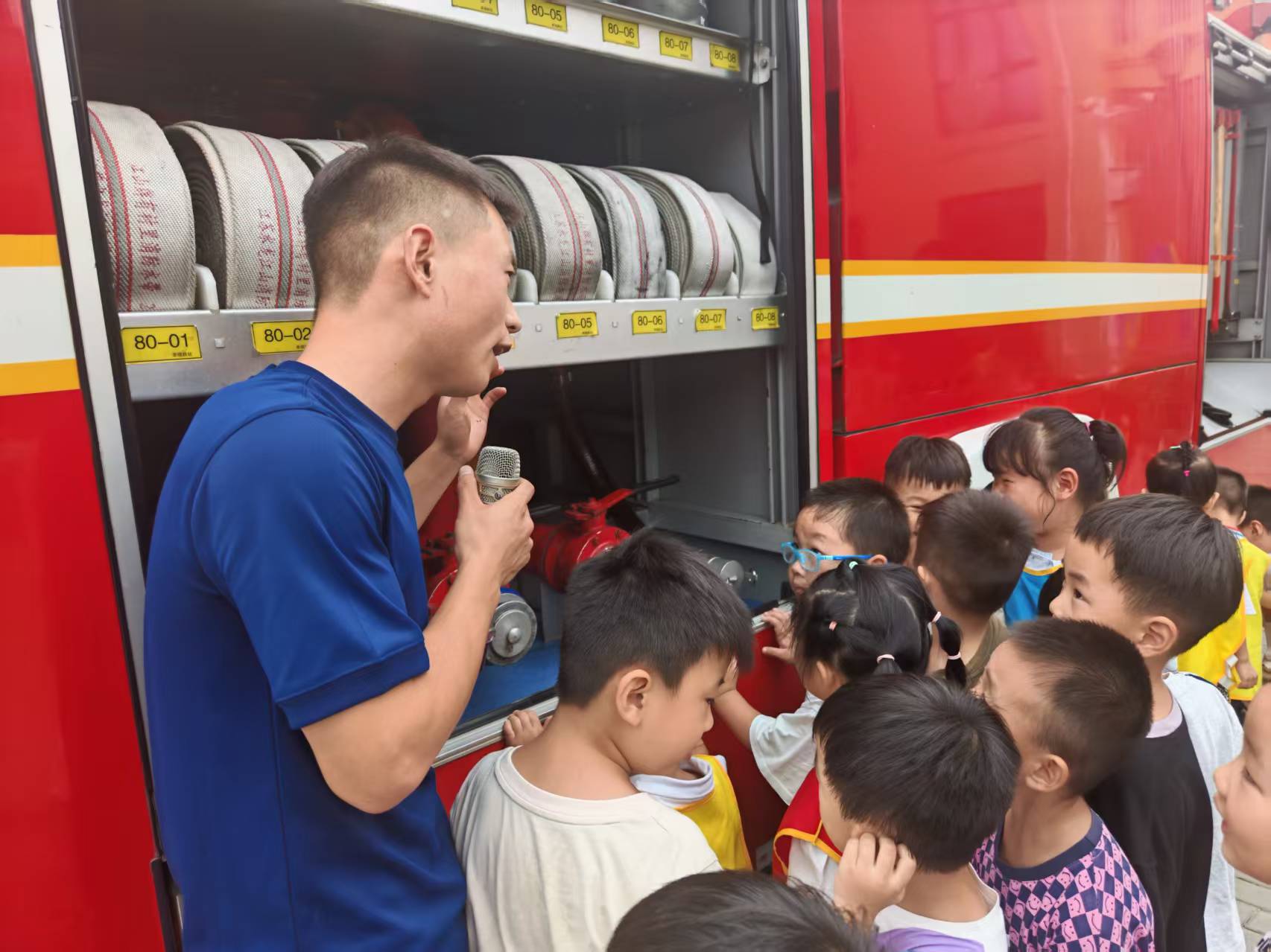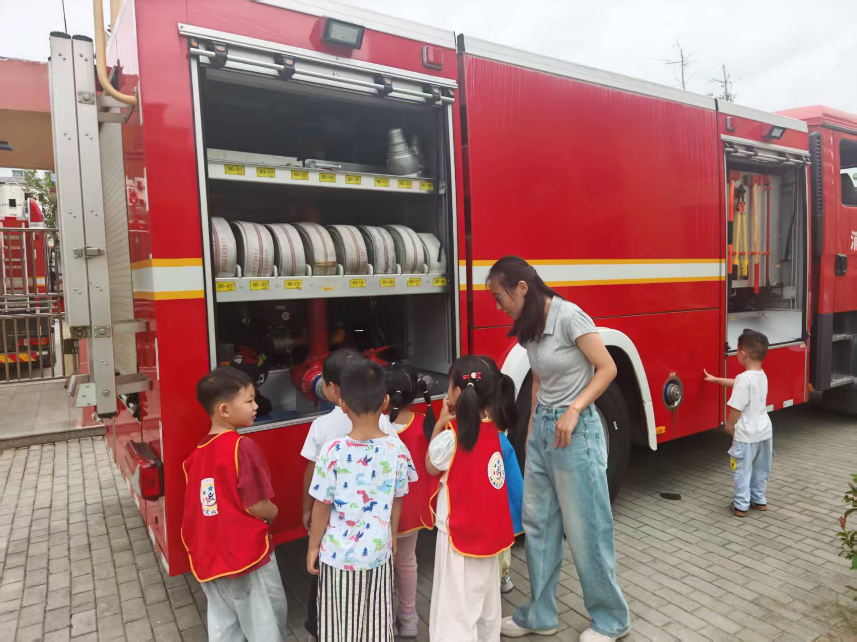 最讓孩子們興奮的是近距離參觀消防車的環(huán)節(jié)。高大的紅色消防車像一座神秘的堡壘,消防員耐心地打開車上的一扇扇門,向好奇的孩子們展示了車內的各種裝備器材,如高壓水槍、消防水帶、破拆工具等,并簡要講解了它們的用途。孩子們睜大了眼睛,認真聆聽,不時發(fā)出陣陣驚嘆。