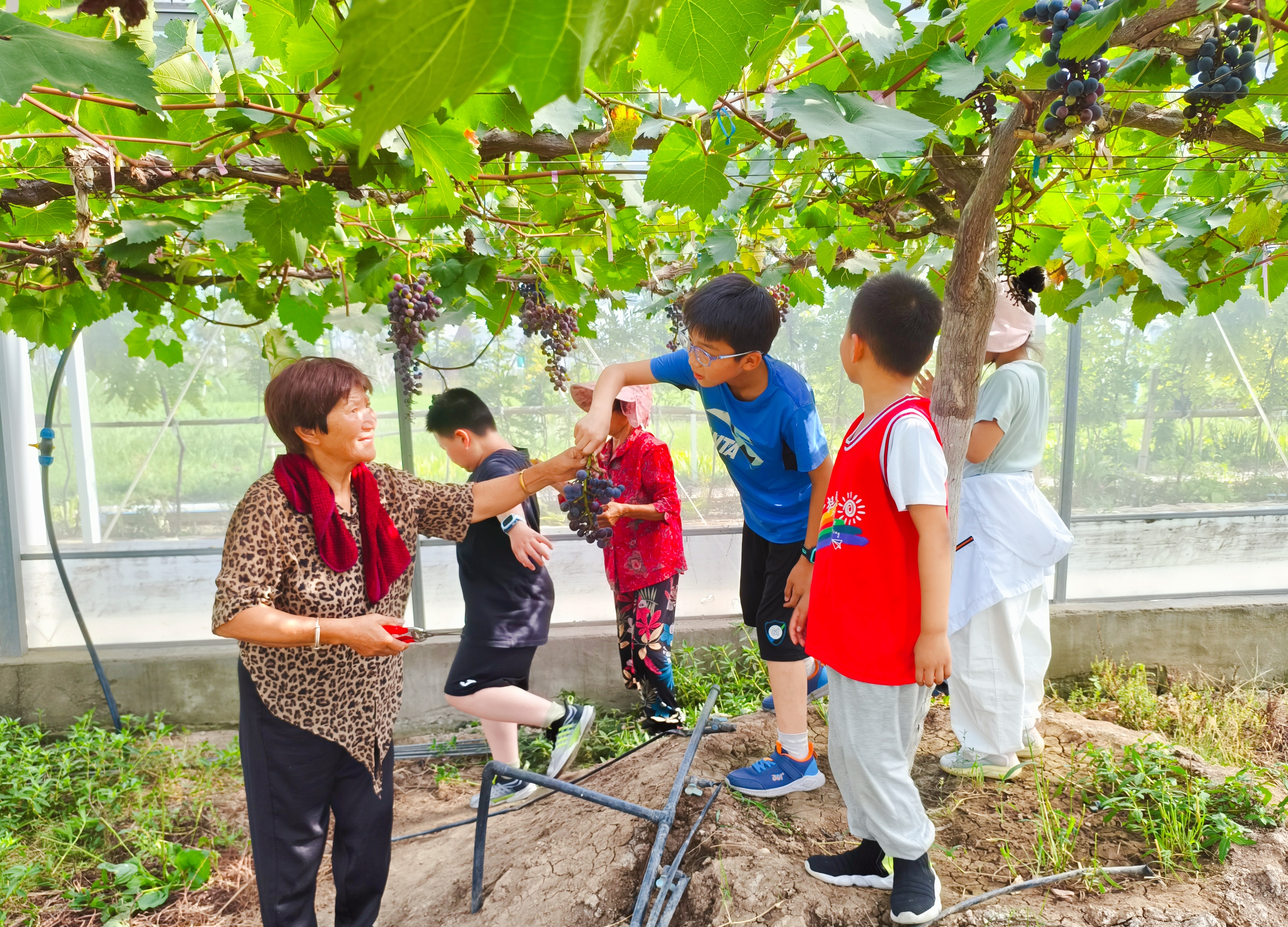 隨后大家分組行動(dòng),在果農(nóng)的帶領(lǐng)下,帶上剪刀和果籃,穿梭于葡萄藤間。小心翼翼地剪下、輕輕地放在籃中,孩子們唯恐損壞果農(nóng)們的辛勞成果。天氣炎熱,衣服被汗?jié)?,但孩子們臉上的笑容比太陽還耀眼?!斑@是我第一次摘葡萄,感覺很有趣?!苯衲?0歲的劉嘉仁興奮地說道。