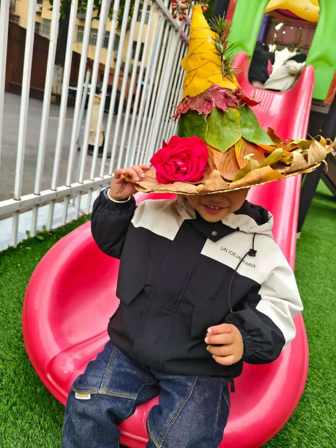 探索結(jié)束后,活動(dòng)進(jìn)入創(chuàng)意手工環(huán)節(jié)。孩子們充分發(fā)揮想象力,將收集來的落葉與花瓣巧妙利用:有的變成精致的落葉帽,有的制作成獨(dú)具匠心的粘貼畫,還有的用彩紙包裹成精美的落葉花束。“看,這是我做的楓葉皇冠!”一位小朋友興奮地展示著自己的作品。