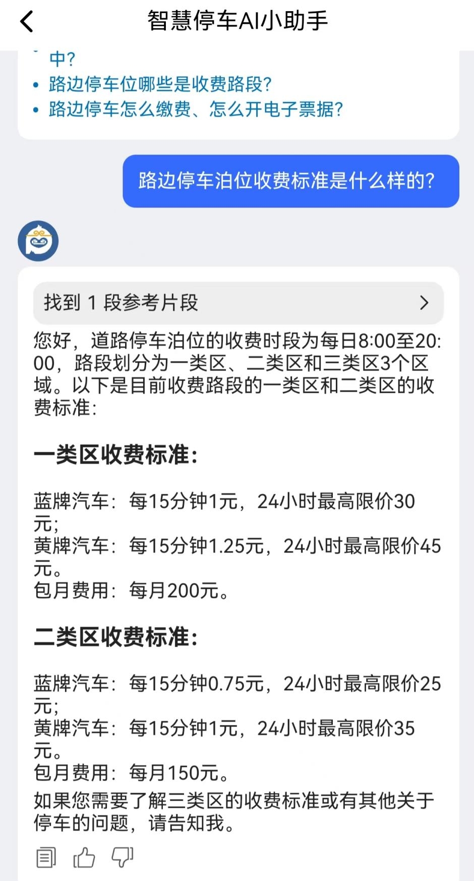 核心功能覆蓋全場(chǎng)景,精準(zhǔn)響應(yīng)市民需求?!爸腔弁\?chē)AI小助手”提供 7×24 小時(shí)智能應(yīng)答服務(wù)。市民只需通過(guò)文字或語(yǔ)音輸入,就能即時(shí)獲取停車(chē)費(fèi)規(guī)則、路段收費(fèi)信息、電子發(fā)票開(kāi)具方法等高頻問(wèn)題的解答,徹底告別等待傳統(tǒng)人工客服的漫長(zhǎng)時(shí)間。