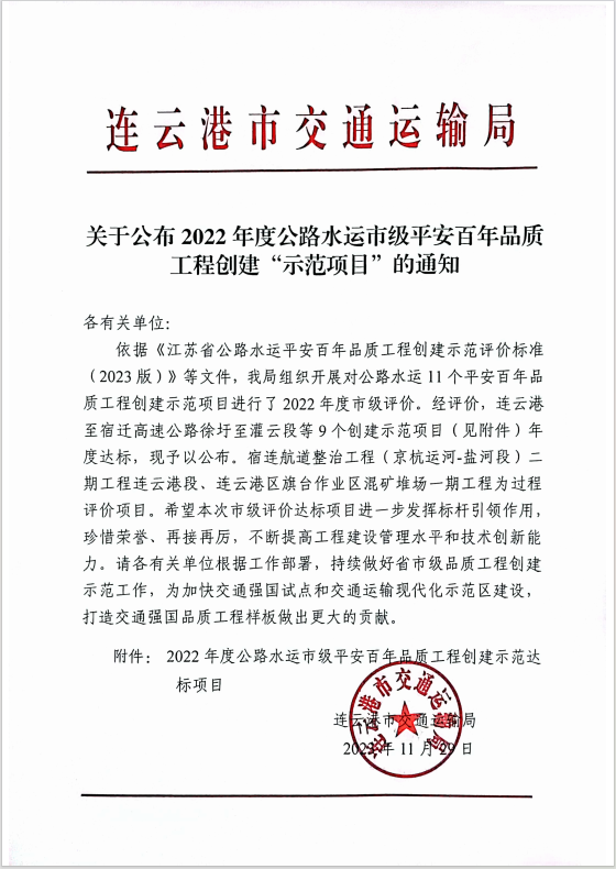 402省道贛榆南環(huán)段路基橋涵工程S402GYNH~SG2標(biāo)段工程項目順利通過2022年度公路水運市級平安百年品質(zhì)工程“示范項目”。