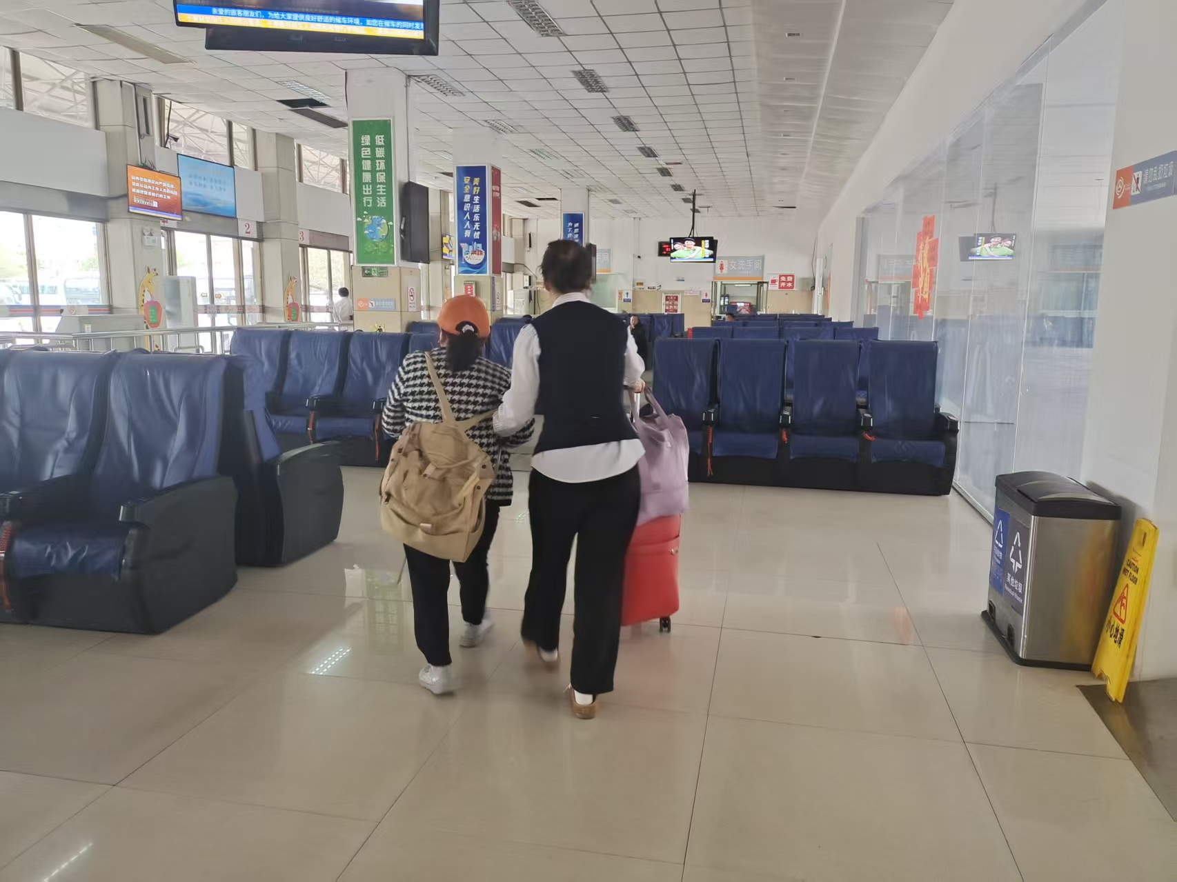 “您好,是要坐車嗎?”駱青立刻快步上前,聲音特意放輕,左手輕輕扶上旅客的胳膊肘,右手順勢接過她手里沉甸甸的布包。原來這位旅客要去沭陽,獨自出門來蘇欣快客站,剛進門就慌了神?!澳鷦e著急,我陪您辦手續(xù)”駱青一邊安撫,一邊扶著她往購票窗口走,每過一個拐角、上一級小臺階,都輕聲提醒:“前面慢一點,有個小坡”“窗口到了,我?guī)湍氵f身份證”。選好了去沭陽的班次,駱青幫著核對信息,把車票和身份證小心翼翼塞進旅客手心:“您拿好,我扶著你去檢票、乘車?!苯又?,駱青拎著布包、行李箱帶旅客過安檢、檢票。上車時,駱青踩著臺階先幫旅客把行李放好,再扶著她上車坐穩(wěn),不忘叮囑駕駛員:“麻煩您路上多照看一下。”