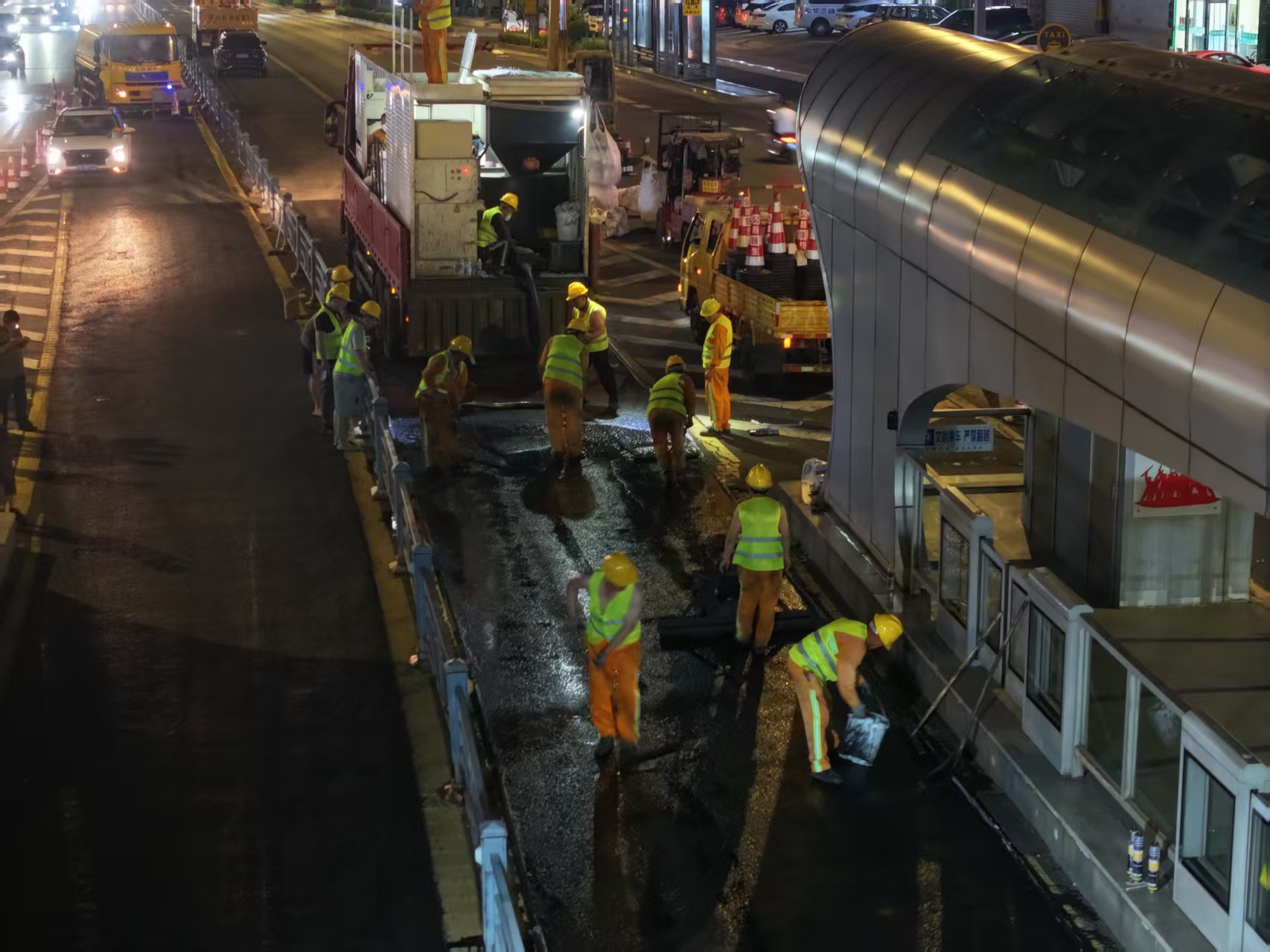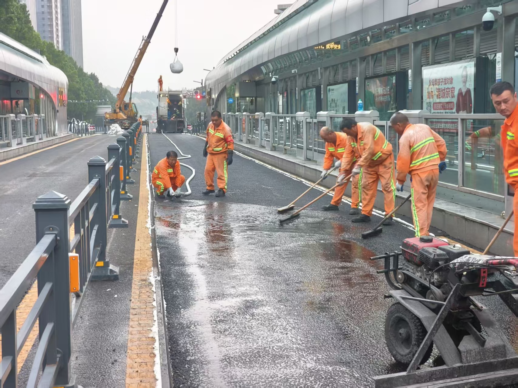 在港城BRT公交站臺專用車道養(yǎng)護項目中,董入龍創(chuàng)新工作室再次扛起“創(chuàng)新大旗”。公司管養(yǎng)的84個BRT公交站臺60米范圍專用車道,因客流量大、車輛??款l繁,路面車轍病害嚴重,傳統(tǒng)養(yǎng)護難以兼顧效率與質(zhì)量。工作室成員共同研判后,選取人流密集的一四九站、墟溝購物中心站及西園路站作為試點,引入“灌注式半柔性路面技術(shù)”。為確保技術(shù)落地,董入龍帶領(lǐng)團隊開展20余次模擬試驗,精準把控材料攤鋪厚度、壓實溫度等核心參數(shù);施工期間,他創(chuàng)新采用“分段作業(yè) + 錯峰施工”模式,協(xié)調(diào)公交部門調(diào)整臨時??奎c,最終僅用72小時便完成3個站臺專用車道的病害整治。經(jīng)后期跟蹤觀測,試點路段路面平整度、抗滑性能均達到優(yōu)質(zhì)標準。
