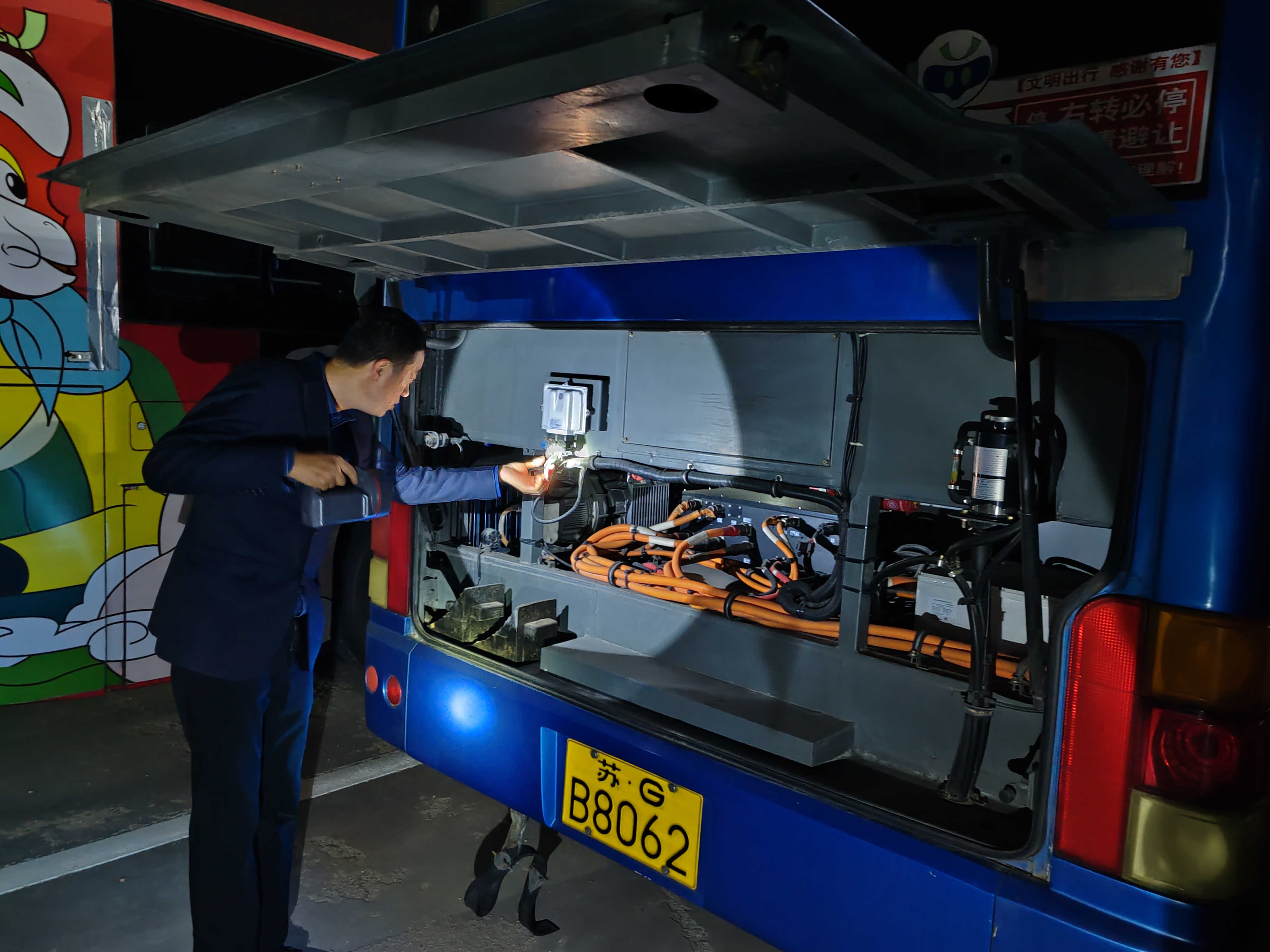 照耀夜色的燈光劃破深夜的寂靜,公交集團權屬海通公交公司管理人員正在對場站內的公交車進行車況和消防器材檢查。手電筒的光束在車輛上來回掃過,秋風中檢查人員的身影顯得格外堅定。每一項零部件都被仔細地查驗,滅火器壓力是否正常使用、逃生錘是否配備齊全,都牽動著他們的心弦。大家深知,公交車承載的不僅是歸家的乘客,更是無數(shù)家庭的期盼與安寧。